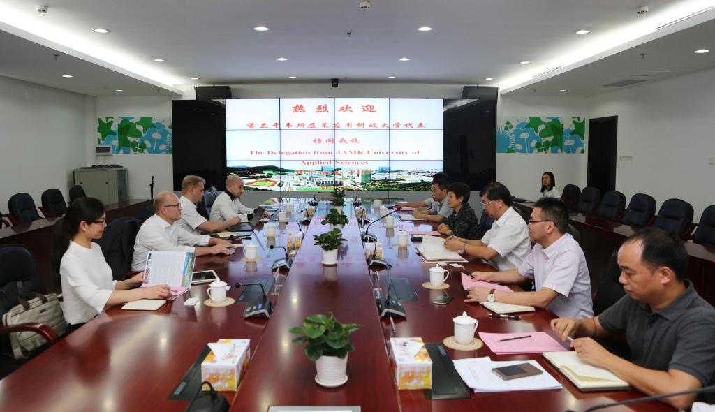 刘锦书记首先对客人的来访表示热烈欢迎,随后双方就各自在本国同类院校中的优势及战略发展方向进行了充分交流。芬兰客人还重点介绍了于韦斯屈莱应用科技大学的系统化质量体系、“以能力为本”教育理念在培养方案、课程设计上的实践以及该校教育国际化实例的分享。两校在未来质量体系合作、课程开发以及师生交流等方面表达了合作意愿,特别是在质量体系建设、师资培训和专本联合培养方面,两校将尽快建立两校合作联络机制,推进项目落地。